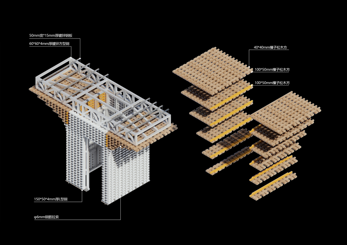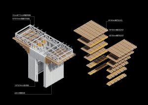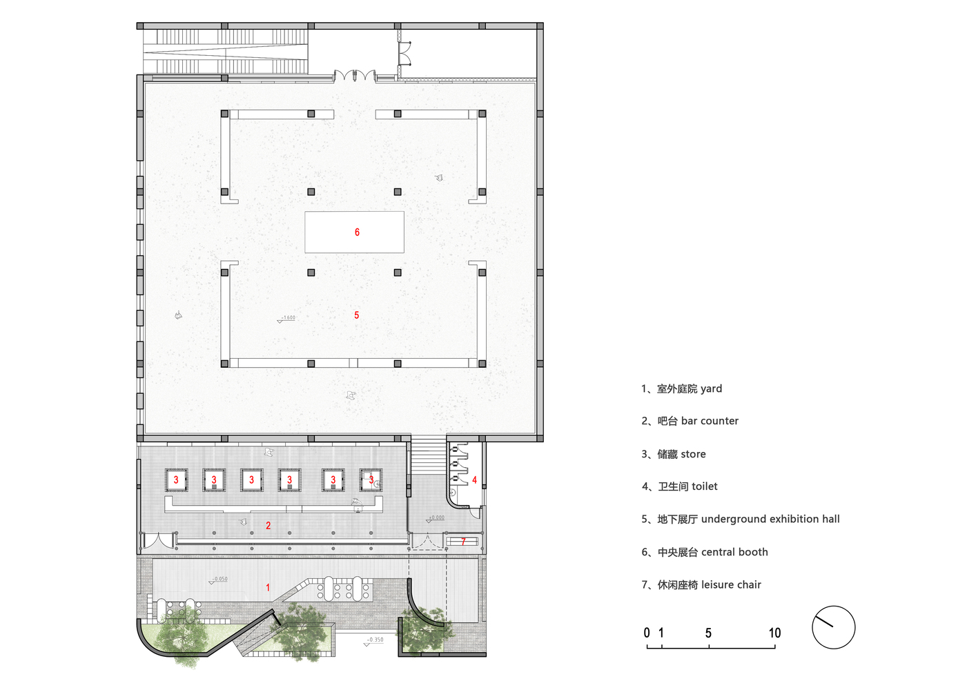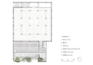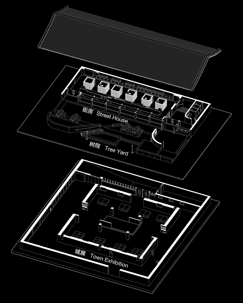 The exhibition hall is a rectangular space of 27 meters by 30 meters on the underground floor. There are 16 columns, arranged in a matrix of 4x4. We want to hide columns and obtain a complete space to meet the exhibition program. the 12 outer columns is transformed into a circle exhibition walls. At the same time, Wall divides the space into a narrow outer corridor and a wide inner square which centre the Micro-scale model of old town. The name of "Town Exhibition" not only reflects the programs of the exhibition, but also expresses that the spacial structure itself.