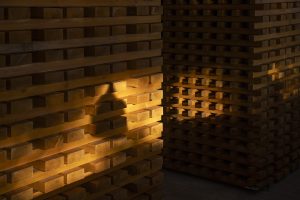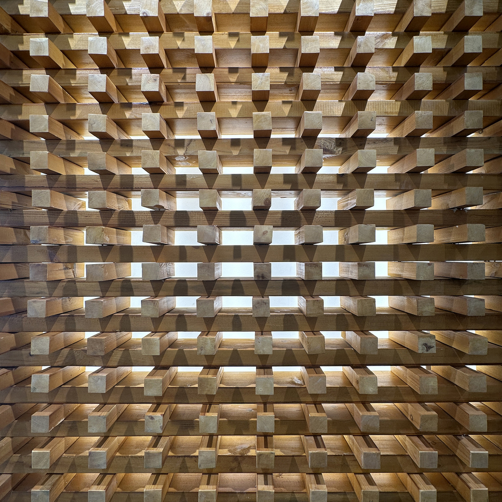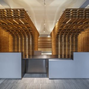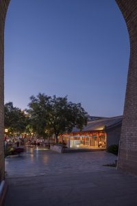 Originally, the room was a row of shops. When the partition were removed, the whole shop becomes a 27X9M entire space for tourist centre. The antiqued facade is too solid to replaced the wooden doors with transparent glazing. In the middle of room, six boxes are lined up, which not only hide the existing columns, but also serve as storage. The outside of boxes is service core. The Six boxes, stacking with wood strips facade, gradually cantilevered towards the outdoor and indoor. the shape of "arch-room" makes them looks like the bottom arcade of The Six-Tower on the central street. Combing with liner space and blue brick pavement, the renewal tourist centre is called "Street House".