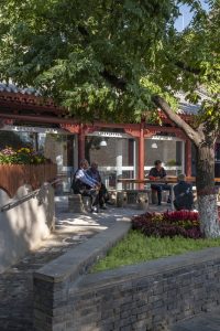 The "Tree Yard" is a rectangular site with 27 x 8 meters in front of building. The three big trees almost covers the entire site. The paving materials are recycled blue bricks, which contrast with the modern transparent glazing facade. Fixed seats are placed under the shade of trees to form a leisurely "tree yard" .